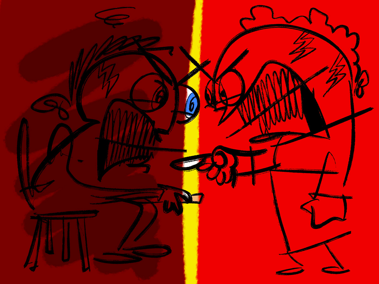 Teeth bared, eyes basically lidless, arms and legs swing-slashing the air to shreds.