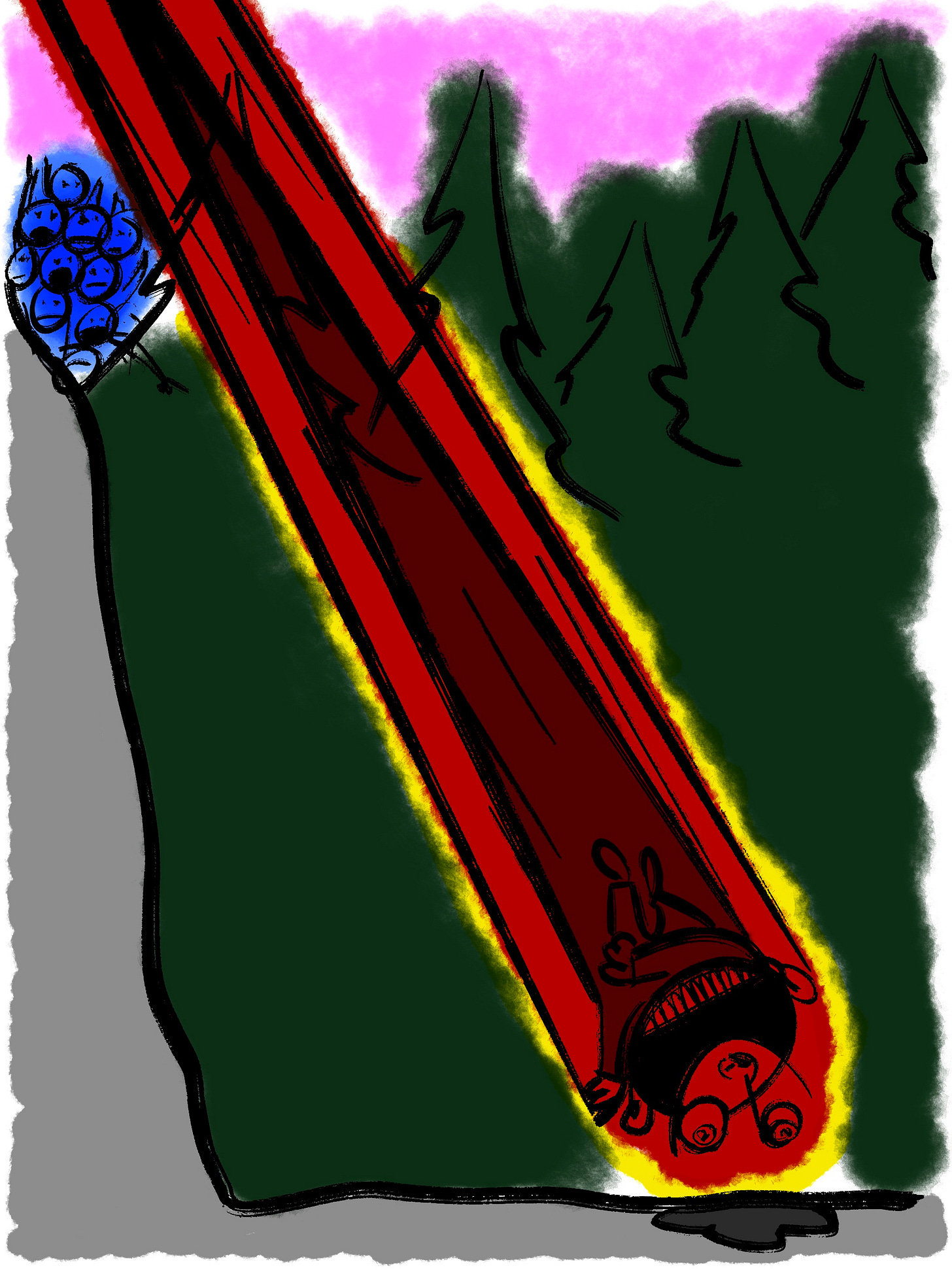He writhed on the ground, making something of a leaf and pine needle angel there, and even while his breath was still long gone, he rasped out an order repeatedly, one we didn’t hear until finally a little wind came back into Peter’s flattened lungs, and the order was a word: “Sick.”